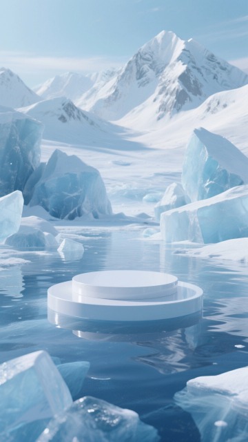 清冷的蓝色调。在波光粼粼的冰面上,主体是一个简洁的白色圆形展台,背景是连绵的雪山和形态各异的冰块,光线柔和,营造出纯净、静谧、清凉的极地氛围