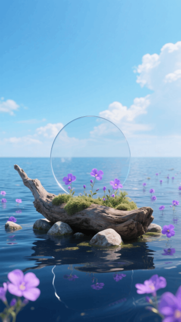蓝天白云,前景是一个超现实植物岛。岛屿上是一些小石头和一块巨大的浮木(上面长着几朵小小的紫色的花朵),有一个巨大的圆型透明玻璃板在浮木后面(竖着正面朝着镜头,特写),周围花朵呈亮紫色散落在岛屿周围。岛屿周围的海水呈深蓝色(波光粼粼),倒映着天空。景色宁静而广阔,辉光加持。