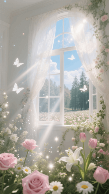 室内白墙复古样式的白色窗框镶嵌透纱窗帘,窗户半开,帘布被风吹拂飘扬,白色发微光的蝴蝶若干散落飞舞周围,室内鲜花绽放阳光从窗外洒入投射光线在鲜花上,花朵绽放葱郁茂盛,花海般的花草藤蔓从室内延伸至室外直至远方的树林;森林,白云,极致净蓝色天空背景