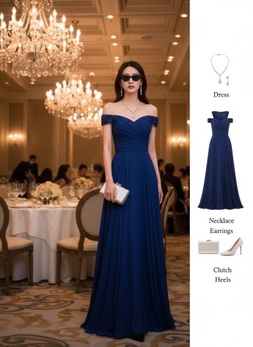 换一套去酒会晚宴的正式装扮,画面左侧三分之二是对应的场景,右侧三分之一白色区域是单独拆解的装扮,并把它们准确在右侧整齐罗列,配以对应的英文文字呈现,OOTD形式,帽子去掉