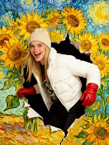 参考图中的人物撕开铺面全屏的画作梵高的向日葵,特写人物从画纸的裂缝中侧身探出,表情兴奋,手臂带有动作。