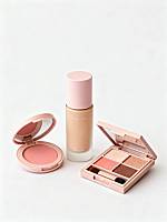 主体放置在中心,主题背后有四组粉状腮红垂直排列(浅粉到蜜桃粉渐变 ),每组倾斜,模拟手指涂抹腮红痕迹,纯净白色背景,均匀光影凸显粉体颗粒堆积、刷痕色彩过渡,借微距视角传递“粉质细腻、显色柔和”