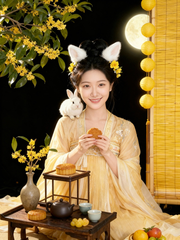 将图1的人物的头部改成古装写真装扮,人物五官、表情、脸型、面部比例必须完全参考图1,100%还原图1人物面部特征,将人物脸上的装饰(眼镜、贴纸)去除。头发梳成复杂的古典发髻,插有黄色桂花,两个白色毛绒兔子耳朵头饰等装饰。正面视角,淡妆,眼睛看着镜头,表情不变。并将图1古装写真装扮的头部放到图2人物的身体上,头肩比保持图2比例,保持衔接自然,人物动作、环境、氛围均保持图2内容不变,保持图2背景环境100%不变。效果应自然融合,不要出现五官变形或面部重绘。