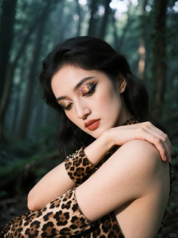 一位长相高级的年轻异域女性正脸特写(低眉垂眼),妆容为浓郁夸张的亮片眼妆、裸色口红,豹纹元素,一只手环在自己肩膀上。后面是原始森林。