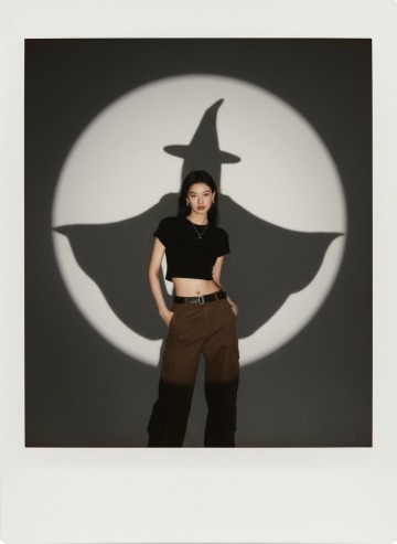 将照片中的主体放在昏暗的白色背景前,主体姿势细节保持不变,闪光灯曝光下,一束圆形射灯照射主体,在墙上投射出一个主体轮廓的投影添加万圣节女巫元素的戏剧性影子,拍立得拍摄效果