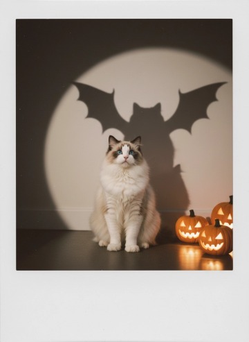 一束光射过来,主体的投影在墙壁上,投影是主体的外轮廓,加恶魔翅膀元素在投影上,主体旁边加点南瓜灯装饰,拍立得拍摄效果