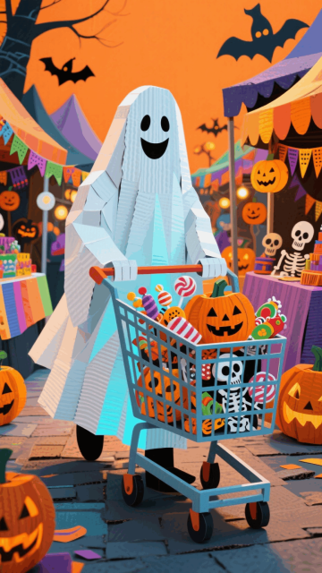 一位推着装满商品购物车、面带笑容的幽灵,两侧万圣节的活动市集,充满活力与欢乐感,橙色背景
