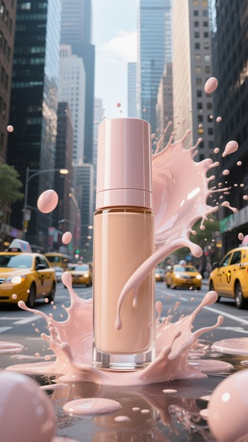 以城市街道(高楼林立,有黄色出租车)为背景,画面中心是一瓶巨大的粉底液,周围飞溅着大量与粉底液同色的液体团块
