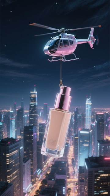 天空中一个直升机吊着一瓶巨大的粉底液,下方是夜晚的繁华都市(高楼林立,灯火璀璨),俯视