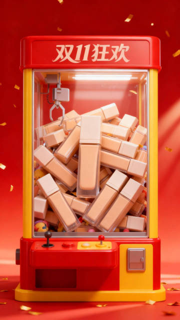 3D写实风格,将画面中的主体提取到一个娃娃机里,主体重复的、拥挤的、密集且杂乱堆叠,堆满娃娃机内部,不留任何空隙,促销风格,娃娃机是红黄配色的,上面写着用优雅的字体写着“双11狂欢”,背景是红色渐变,有一些金色碎屑点缀,有光线效果。