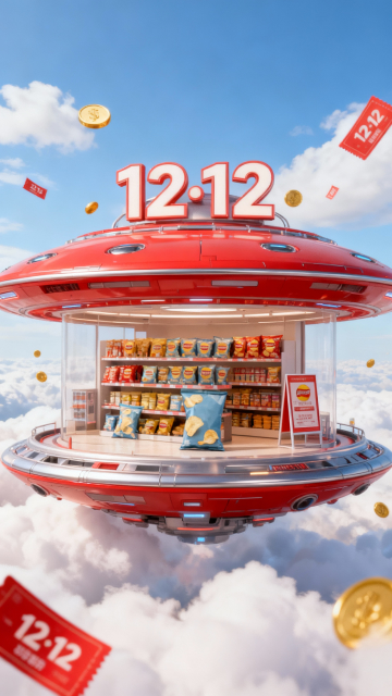 3D 科幻写实风格,中心构图,色彩鲜艳。画面主视觉是科幻飞碟造型的双层空间,红色、银色主色调,远景。内部陈列图示产品的产品货架、立牌,细节精致如真实店铺,顶部镶嵌“12·12”大字标识。飞船悬浮于云海之上,背景是蓝天白云。周围漂浮着金色金币、红色优惠券(印有“12·12”标识),增强促销氛围。