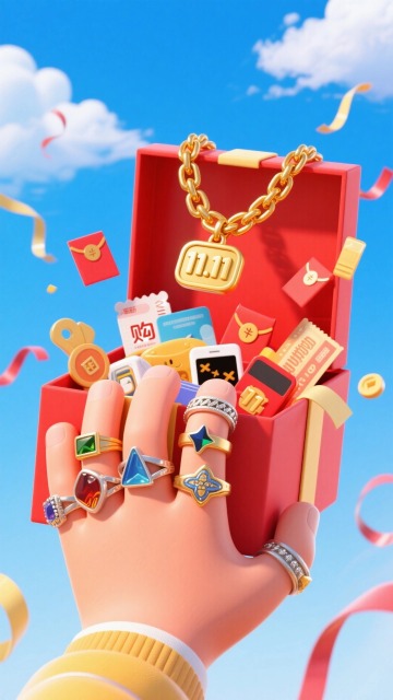 画面中心是一只托着红色礼盒的手(手部细节:带着许多酷酷的戒指。礼盒细节:内部放着琳琅满目的商品、购物券和红包,一条带有“11.11”吊坠的超粗的大金链子从盒子里漏出)。蓝天白云,周围飘着彩带。画面重心偏下,平视