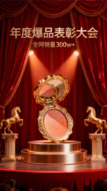 写实风,奢华感,主色调为高饱和亮红搭配奢华金色,舞台下方仰视视角。主体位于舞台上的双层金属圆形展台上(占30%视觉比例),顶部暖色聚光灯投射于主体,背景为垂坠感红色丝绒幕布(装饰金色走线),两侧装饰华丽金马造型欧式石柱(前景左右对称)。画面上方为3d金属细体亮金色文字“年度爆品表彰大会”,副标题金属小字“全网销量300w+”。