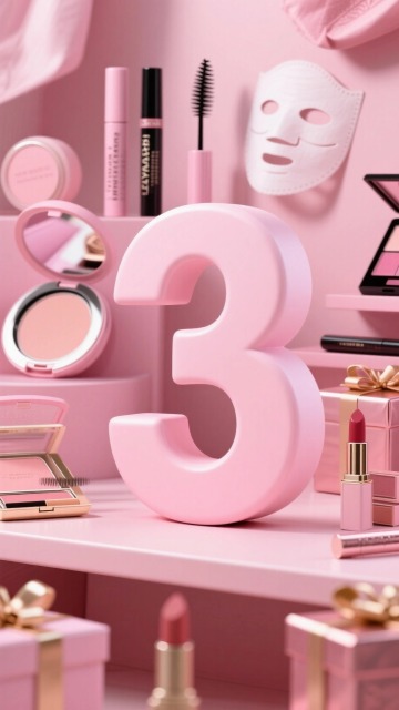 巨大的3D数字“3”置于桌上,背景粉饼、睫毛膏、面膜、眼影盘、腮红盘、口红、礼盒组成的场景