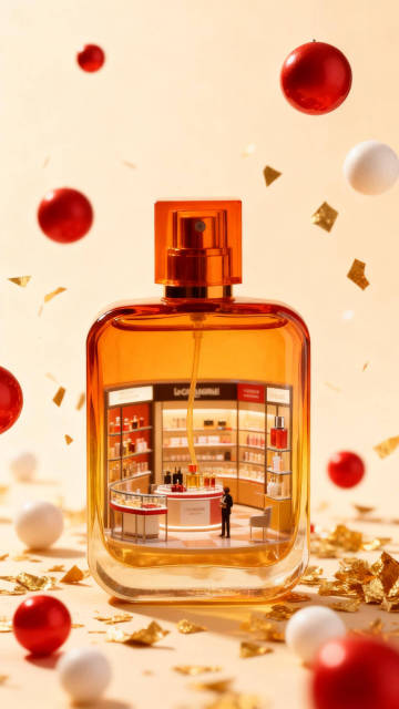 以科技感繁华街区为背景,中央是图中主体巨大化,主体倍放置在霓虹展台上,主体瓶身内设计成橱窗形式,无LOGO,瓶身内展示着各类化妆品。瓶身上挂着塑料霓虹灯牌效果“双11 美妆专场”。
