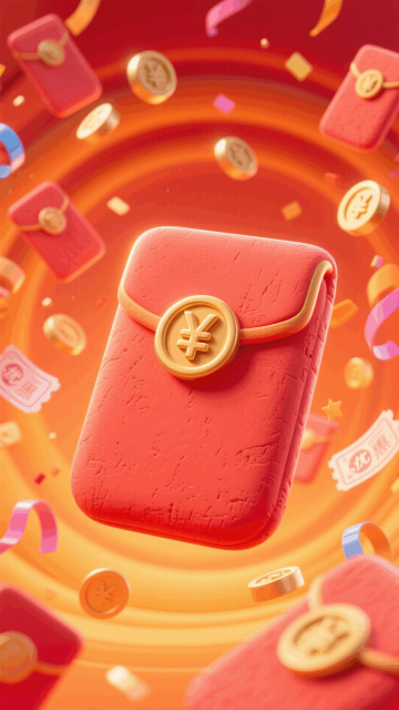 前景是一个大的红色红包悬空(带着“¥”符号的金扣),背后散发着光芒,背景是一个节日漩涡,橙红渐变色的漩涡中有许多红包、金币、优惠券、彩带等。热闹氛围。