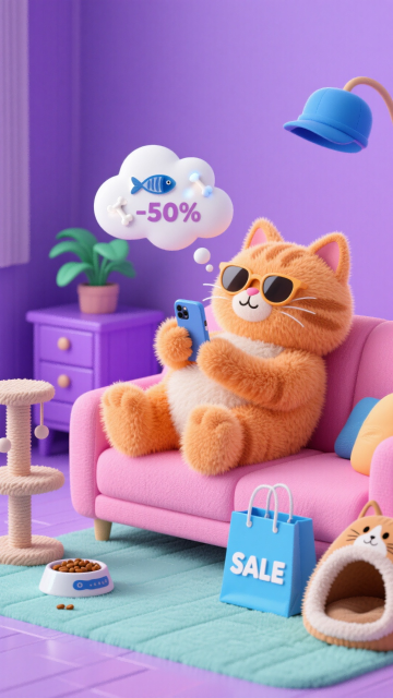 一只可爱橘猫,躺在粉色沙发戴着墨镜玩手机,脑袋旁边有白色云朵气泡,里面是鱼骨头、“-50%”数字图标;点缀猫粮碗、猫爬架、猫窝、印有“SALE“的购物袋、蓝绿色植物、紫色柜子和蓝色帽子,紫色背景,客厅氛围