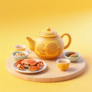 一个圆形浅色木板底座,上面有传统纹样的暖黄色茶壶,周围摆放着一盘装有螃蟹的盘子、茶杯、盛有小食的小碗,浅黄色渐变背景