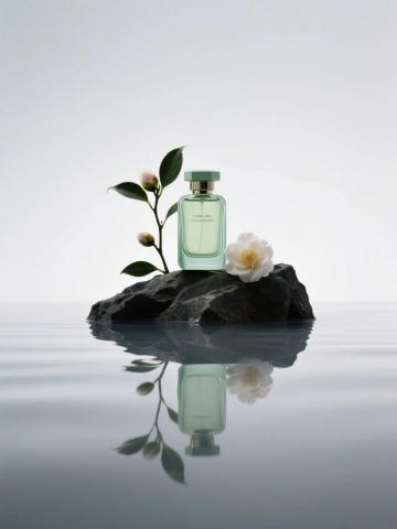 特写浅绿色香水瓶,置于深色山石上,搭配自然枝叶、山茶花点缀,用光影突出瓶身质感,呈现水面倒影,白色背景