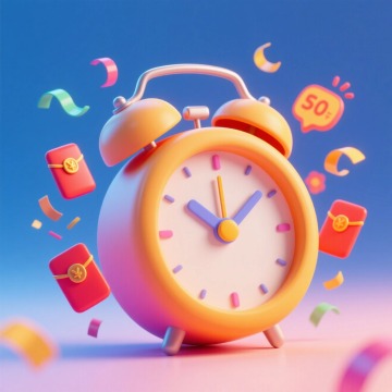 一个促销感的闹钟,漂浮着红包、彩带相关的促销装饰元素,撞色