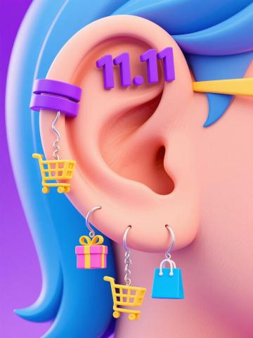 耳朵上挂满耳环的特写,耳环造型分别是:“11.11”、购物车、礼盒、购物袋,紫色背景