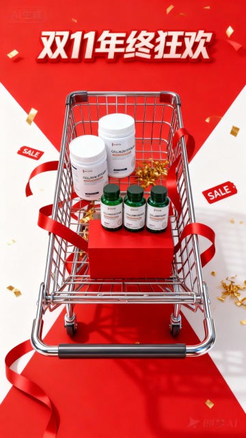 以红橘细腻粉末纹理为背景,中央是银色购物车,图内商品被装入购物车内,周围散落彩色礼盒、写着"SALE"、“11.11 狂欢季”的促销标签,整体营造购物氛围。