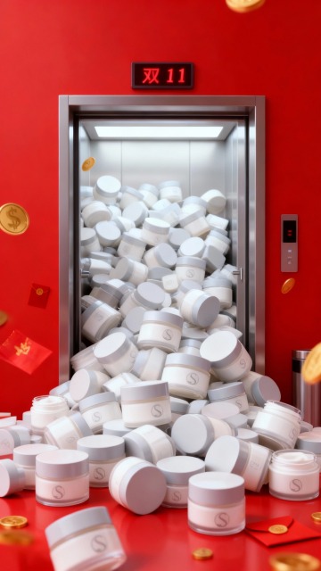将画面中的主体提取到一个开门的电梯画面,主体重复的、拥挤的、密集且杂乱堆叠,堆满内部,从电梯中涌出到画面前方,电梯上显示屏有“双11”,点缀金币、红包,红色主色调