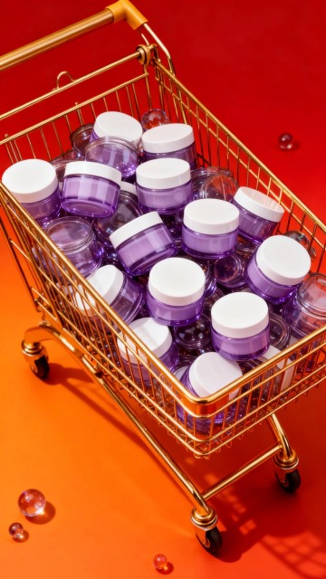 将画面中的主体提取到一个俯视的金色购物车里撑满画面,主体重复的、拥挤的、密集且杂乱堆叠,堆满内部,不留任何空隙,背景是背景为红橙渐变,整体风格大气炫酷,有玻璃小球在地上点缀