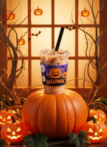 主体放在圆形南瓜上,前景点缀南瓜灯,植物叶片,两边搭配枯树枝;背景橙色渐变,木制窗户,窗外暖光,点缀南瓜、小蝙蝠,背景虚化,万圣节氛围