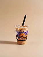 以 “Happy Halloween” 和 “Trick or Treat” 为核心文字。“Halloween” 采用夸张的卡通艺术字体,其中字母 “O” 设计成南瓜灯造型,整体色彩以橙色为主,风格活泼有张力,突出万圣节的节日氛围,深色背景
