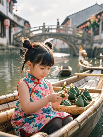 一名7-8岁的女孩,身穿旗袍,哪吒头,坐在一艘龙舟上剥粽子,背景为小桥流水古镇