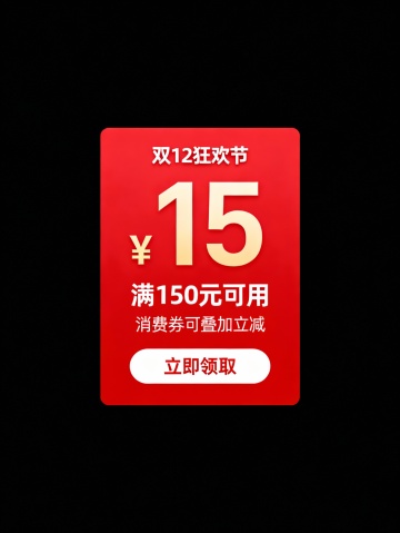 主体为一个红色矩形浮层,顶部标注“双12狂欢节”,中央以超大字体突出“¥15”消费券金额,下方注明“满150元可用”及“消费券可叠加立减”。底部白色按钮“立即领取”。