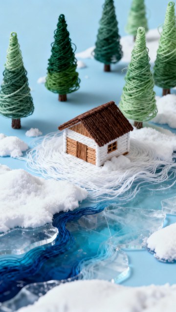 背景是一座积雪的高山,与飘着雪花的淡蓝色天空相融,中景是错落分布的彩色小屋,屋顶和地面都覆盖着雪,有几棵光秃秃的树木和几株蓝绿色的松树,有一条蜿蜒的小路,还有一座白色的灯塔带红色的塔顶,前景是一片蓝色的海湾,一艘红色的小船在水面上行驶,岸边的雪地纯净洁白,边缘露出一些枯树枝。