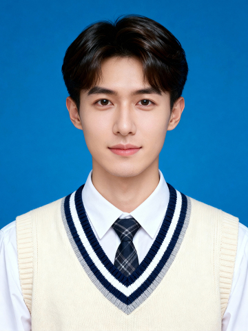 参考第一张图保留人物脸型、发型、年龄特征生成证件照标准样式;痘印瑕疵精准去除,肤质精细化处理提亮肤色,均匀肤色;外穿奶白米色学院风针织背心,内搭白色翻领长袖衬衫,背心领口有深蓝色、白色和浅灰色条纹装饰;领口处搭配深色格纹领带;参考第二张图的人物占位和比例,居中平视正面视角,纯正面,胸部以上半身像;消除暗沉轻度磨皮,去除一切饰品;光线均匀柔和,画质清晰,表情自然,头部完整,去除人物之外的所有元素,简约蓝色背景;按照第一张图的内容生成。