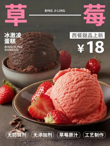 画面上方左上角粉色大标题”草“、右上角”莓“,两个字中间有白色横线,上面有小字”BING JI LING“,左侧副标题”冰激凌 蛋糕”小字“BINGJILINGDANGAO“,右侧标签”西餐甜品上新“、”¥18“;画面下方小标签”无防腐剂、”“无添加剂“、”草莓原汁”、“工艺制作”,白色字,具有版式设计感