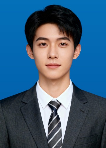 参考第一张图保留人物脸型、发型、年龄特征生成证件照标准样式;消除痘印,肤质优化处理提亮肤色,均匀肤色;外穿高级深灰色西装,内搭白色翻领长袖衬衫,搭配条纹领带;参考第二张图的人物占位和比例,居中平视正面视角,纯正面,胸部以上半身像;消除暗沉轻度磨皮,去除一切饰品;光线均匀柔和,画质清晰,表情自然,头部完整,去除人物之外的所有元素,简约蓝色背景;严格按照第一张图的内容生成。