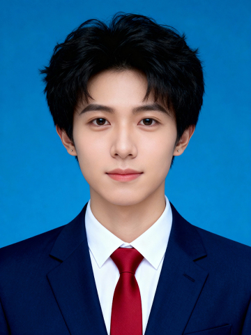 参考第一张图保留人物脸型、发型、年龄特征生成证件照标准样式;消除痘印,肤质优化处理提亮肤色,均匀肤色;外穿高级深蓝色西装,内搭白色翻领长袖衬衫,搭配红色领带;参考第二张图的人物占位和比例,居中平视正面视角,纯正面,胸部以上半身像;消除暗沉轻度磨皮,去除一切饰品;光线均匀柔和,画质清晰,表情自然,头部完整,去除人物之外的所有元素,简约蓝色背景;严格按照第一张图的内容生成。