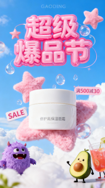 大师级排版,超现实潮流拼贴海报,以澄澈蓝天(点缀柔白云朵)为背景,视觉中心是商品,上方是芭比粉3D充气字体“超级爆品节”,周围环绕粉色毛绒星星、透明水滴状装饰、膨胀风促销元素、卡通元素(紫色小怪兽、牛油果小人、果汁元素);左侧文字标签“SALE”,右侧文字标签“满500减30”,顶部标注“GAODING”品牌名;整体用高饱和色彩、充气质感与卡通元素,营造活泼有张力、充满想象力的潮流氛围。