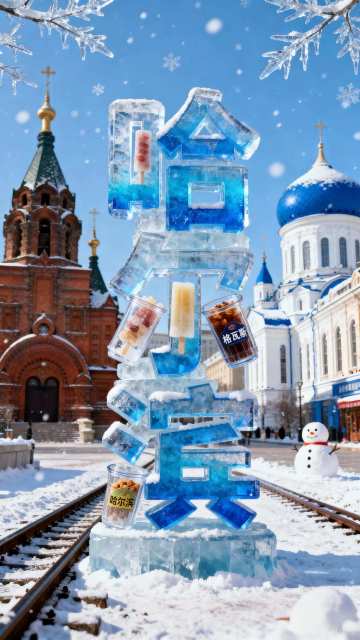 画面主视觉是由蓝色渐变冰晶堆叠而成的 “哈尔滨”艺术字。冰面覆雪,带有纹理细节,文字冰晶作为透明容器,内部冰封着冰棍、格瓦斯等哈尔滨特色食物。背景是哈尔滨中央大街欧式建筑群落,地面延伸出积雪铁轨、雪人。天空湛蓝,飘雪花,边缘点缀冰雕树枝。