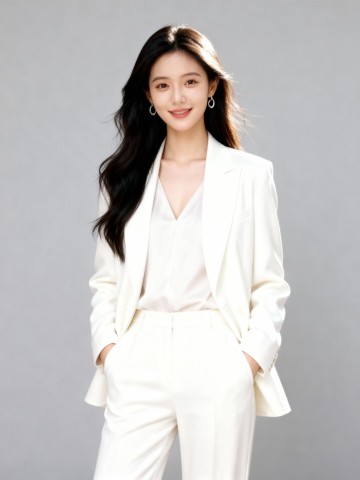 保留人物脸型、发型、年龄特征生成职场形象照,室内七分身人像,50mm标准焦段,F/4光圈(F/2.8-F/4区间),相机与人物距离3米,横向16:9比例(左右预留环境空间),人物占画面60%,入镜头部至膝盖上方5cm,平视视角,人物居中构图,头肩比例协调,侧逆光打光,主体锐利,美颜磨皮韩式精致自然的浓妆,均匀肤色提亮肤色,身穿白色西装外套和西裤,同色系V领内搭,高级简约耳环,穿搭简约高级, 发质自然垂落有层次,淡雅清新; 双手插兜的姿态呈现,站立姿势, 臀部以上半身像,中心构图,头肩比例协调, 浅浅微笑,表情、肢体动作自然生动; 专业人像摄影,柔和自然打光,画质清晰,头部完整,高清棚拍专业摄影人像写真,去除人物之外的所有元素,简约中度灰色纯色背景。