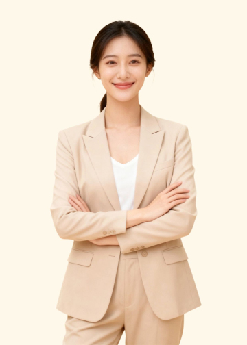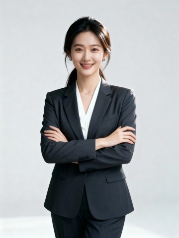 保留人物脸型、发型、年龄特征生成职场形象照,室内七分身人像,50mm标准焦段,F/4光圈(F/2.8-F/4区间),相机与人物距离3米,横向16:9比例(左右预留环境空间),人物占画面60%,入镜头部至膝盖上方5cm,平视视角,人物居中构图,头肩比例协调,侧逆光打光,主体锐利,美颜磨皮韩式精致自然的浓妆,均匀肤色提亮肤色,外穿V领深空灰色西装,内搭白色V领衬衫; 搭配极简耳钉细链项链;发质柔顺光泽;双臂交叉于胸前,姿态规整舒展,传递出自信从容的气场. 表情自然,干练;微笑; 专业人像摄影,柔和打光,画质清晰,头部完整,高清棚拍专业摄影人像写真,去除人物之外的所有元素,臀部以上的半身照,简约浅灰色纯色背景。