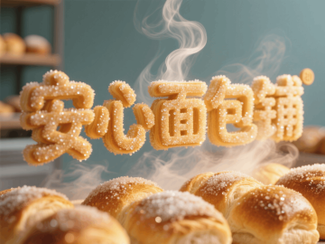 一个用面包做成的“安心面包铺”大字,面包呈金黄色,表面撒有细砂糖,上面冒着热气