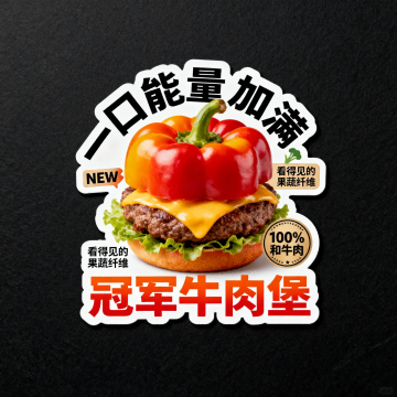 主体汉堡——用彩椒替代传统面包顶,牛肉饼、融化的芝士与生菜。环绕“一口能量加满”,搭配“NEW”标识与“看得见的果蔬纤维”小标签;底部“冠军牛肉堡”橙红色调字体标题,辅以“100%和牛肉”圆形徽章。