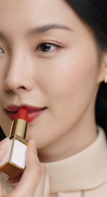 产品宣传广告,无字幕。 完整台词:GD高定口红,白晶奢华感外壳,浓郁正红一抹显白,丝绒质地持久锁色,为你加持气场,每一次出场都成焦点。