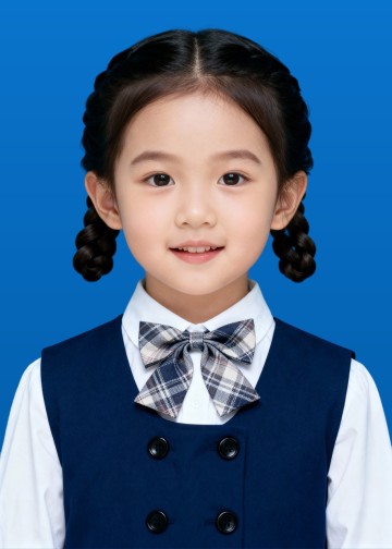 生成标准样式证件照:参考第一张图保留人物脸型、发型、年龄特征;参考第二张图的人物占位和比例;肤色肤质:提亮肤色,消除暗沉,轻度磨皮,轻度美颜,清透裸妆,隐形毛孔,均匀肤色,眉形整洁,唇色自然提亮;构图布局:纯正面,胸部以上半身像;头部居中,头顶距上边缘约10%,下巴距下边缘约30%,左右耳对称露显,肩部平展,上半身占画面下方约40%,人物占比约画面的60%-70%;光线画质:均匀柔光,面部明亮无硬影,背景均匀提亮,画质清晰,零噪点降噪;照片要求:免冠,脸部无遮挡露出五官,表情自然,露额露耳;其他要求:去除首饰,去除头饰,去除人物之外的所有元素,头部完整;服饰背景:内穿白色长袖衬衫,外搭V领藏青色马甲,领口系着千鸟格装饰领结搭配藏青色饰边,领结中间有一枚金属质感的圆形装饰扣,简约蓝色纯色背景;