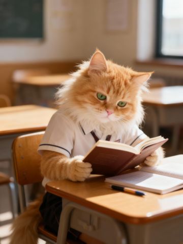 一幅猫拟人化学生在课桌上的场景图。画面中的猫穿着短袖校服坐在课桌前,猫爪握着书,身体微微倾斜,显得有些疲惫。它的眼神中透露出一丝倦意,但依然保持着专注。课桌上摆放着书本、笔,显示出忙碌的学习氛围。背景是教室。