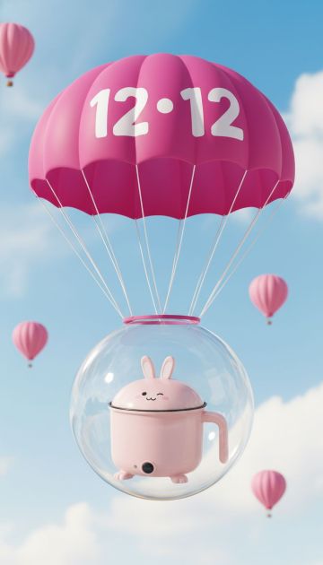 3d写实风格。画面中央是一只玫红色“12·12”标志降落伞,伞下方挂着一个透明气泡,特写气泡里的图中主体。背景是一些虚化的粉色小热气球飘浮在空中,色彩明亮鲜艳。