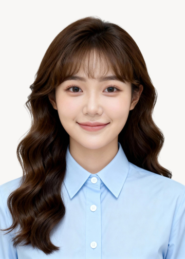 保留人物脸型、年龄特征生成标准职场形象照,50mm焦段,F/4光圈(F/2.8-F/4区间),相机与人物距离3米,横向16:9比例(左右预留环境空间),人物占画面60%,入镜头部至膝盖上方5cm,平视视角,人物居中构图,头肩比例协调,主体锐利,双侧打柔和光,美颜磨皮韩式精致浓妆,冷白皮,均匀肤色提亮肤色,身穿白色西装;浅蓝色衬衫内搭,下装白色西裤;佩戴极简银色小耳钉。左臂自然交叉于胸前,肘部微收;右臂抬起,肘部微屈,手腕轻抬至胸前右侧位置。右手呈优雅的半握式姿态,食指与中指轻拢,无名指和小指自然弯曲,指尖微微向内收拢,精致内敛有气质。站立姿势,干练霸气,披发,发梢微卷,眼神直视镜头,目光温柔澄澈,表情自然,嘴角微微上扬,气质自信从容;均匀肤色,专业人像摄影写真,头部完整,结构准确;光比1:1.5,4800K中性光,修饰脸型,肤质哑光细腻,轻透裸肌感,真实毛孔纹理,32K画质,去除人物之外的所有元素,零噪点降噪,简约中灰度纯色背景。