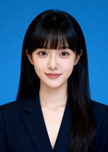 保留人物脸型、年龄特征生成标准职场形象照,50mm焦段,F/4光圈(F/2.8-F/4区间),相机与人物距离3米,横向16:9比例(左右预留环境空间),人物占画面60%,入镜头部至膝盖上方5cm,平视视角,人物居中构图,头肩比例协调,藏青灰色亚面oversize西装(精纺面料),黑色V领衬衫,精致黑色细皮带搭配藏青灰色亚面西裤(精纺面料)。双臂自然抱胸,自信从容;主体锐利,双侧打柔和光,美颜磨皮韩式精致浓妆,均匀肤色提亮肤色,站立姿势松弛随性自然,长发披肩发质柔顺光泽飘逸,眼神直视镜头,目光坚定且澄澈,表情自然.嘴角上扬,气质自信从容沉稳霸气;均匀肤色,专业人像摄影写真,头部完整,结构准确;光比1:1.5,4800K暖调中性光,修饰脸型,肤质哑光细腻,面部雾面柔光,轻透裸肌感,真实毛孔纹理,32K画质,去除人物之外的所有元素,零噪点降噪,简约偏冷调中深灰度纯色背景。