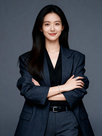 保留人物脸型、年龄特征生成标准职场形象照,50mm焦段,F/4光圈(F/2.8-F/4区间),相机与人物距离3米,横向16:9比例(左右预留环境空间),人物占画面60%,入镜头部至膝盖上方5cm,平视视角,人物居中构图,头肩比例协调,藏青灰色亚面oversize西装(精纺面料),黑色V领衬衫,精致黑色细皮带搭配藏青灰色亚面西裤(精纺面料)。双臂自然抱胸,自信从容;主体锐利,双侧打柔和光,美颜磨皮韩式精致浓妆,均匀肤色提亮肤色,站立姿势松弛随性自然,长发披肩发质柔顺光泽飘逸,眼神直视镜头,目光坚定且澄澈,表情自然.嘴角上扬,气质自信从容沉稳霸气;均匀肤色,专业人像摄影写真,头部完整,结构准确;光比1:1.5,4800K暖调中性光,修饰脸型,肤质哑光细腻,面部雾面柔光,轻透裸肌感,真实毛孔纹理,32K画质,去除人物之外的所有元素,零噪点降噪,简约偏冷调中深灰度纯色背景。